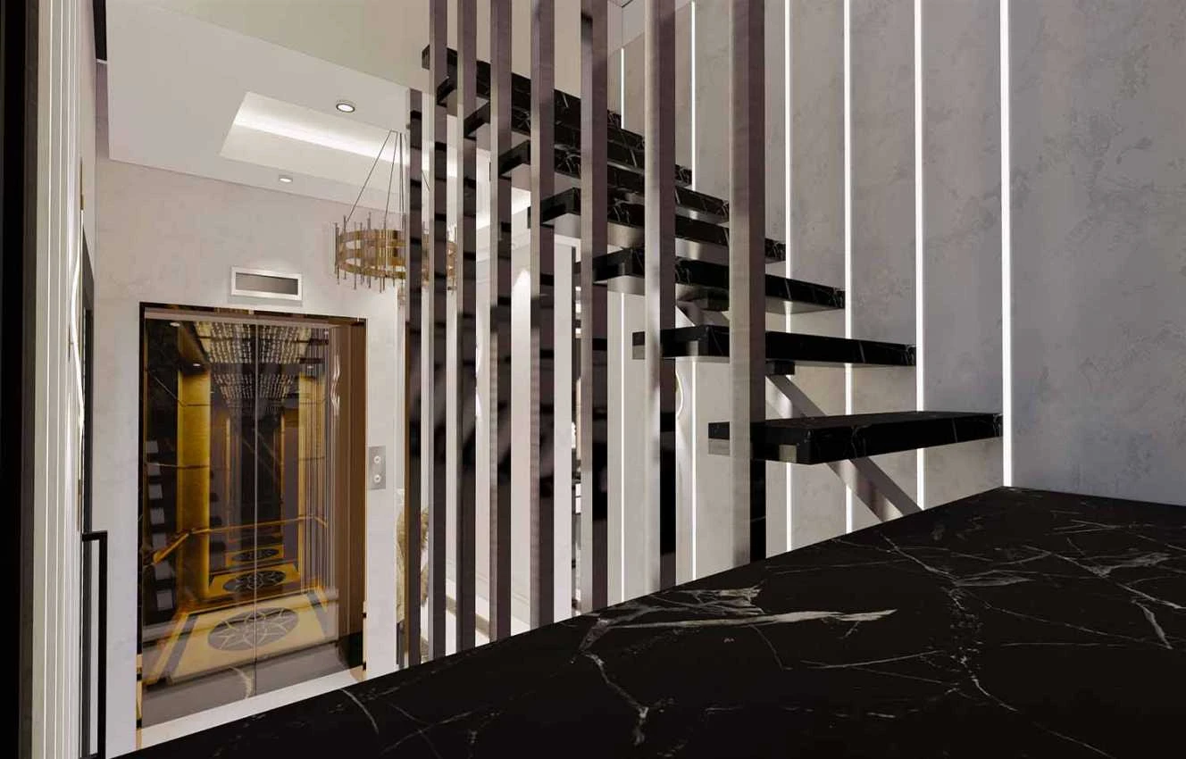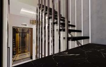 Лифт и лестница, ведущая на каждый этаж.