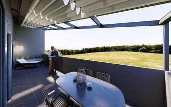 Пентхаус: Основной люкс в 50м2 с большей ванной комнатой и джакузи, на этаже есть кухня и бар с выходом на основную терассу в 75м2 с оборудованной зоной барбекю. Вид с этого этажа идеален — это вечно зеленые оливки и пальмы с полосой голубого горизонта синего моря.